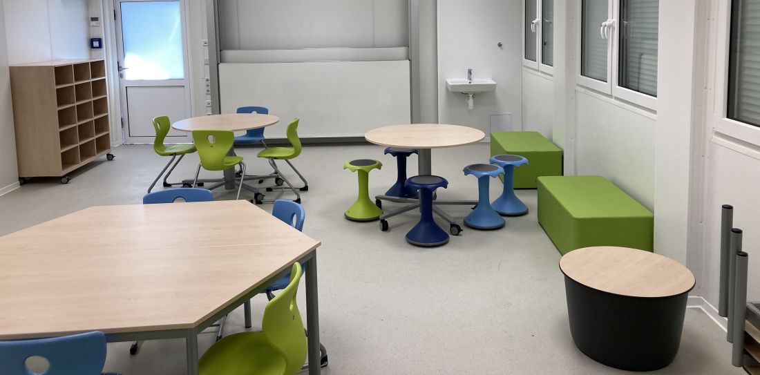 In allen vier Räumen befinden sich ausreichend Schränke für die Lehrmaterialien der Schülerinnen, Schüler und Lehrkräfte, sodass notwendige Lehrmittel direkt in den Räumen verstaut werden können. Zur weiteren Flexibilität wurden die halbhohen Schränke auf Rollen gestellt und können so nach Bedarf flexibel im Raum platziert werden. Alle Räume wurden außerdem mit Doppelschiebetafeln ausgestattet. Die Kosten für die Maßnahme beliefen sich insgesamt auf rund 1 Mio. Euro.