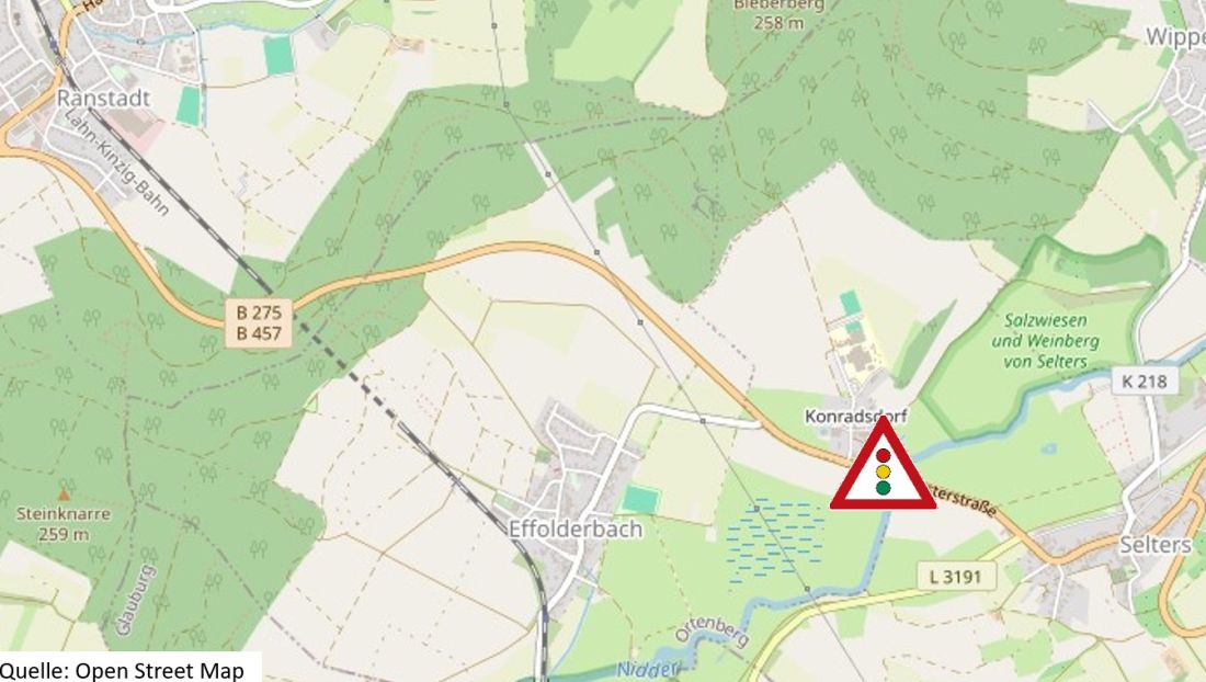 Wegen weiterer Baugrunduntersuchungen an der Fahrbahn muss Hessen Mobil von Mittwoch, 20.11.2024, bis voraussichtlich Freitag, 22.11.2024, die Bundesstraße 275 zwischen Ranstadt und Ortenberg/Selters, nun im Bereich der Einmündung nach Ortenberg/Effolderbach, abschnittsweise halbseitig sperren.