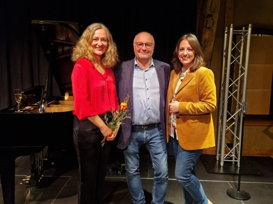 Pianistin und Kabarettistin Anne Folger mit Horst Steuernagel (1. Vorsitzender Kultur in Reichelsheim e.V.) und Bürgermeisterin Lena Herget