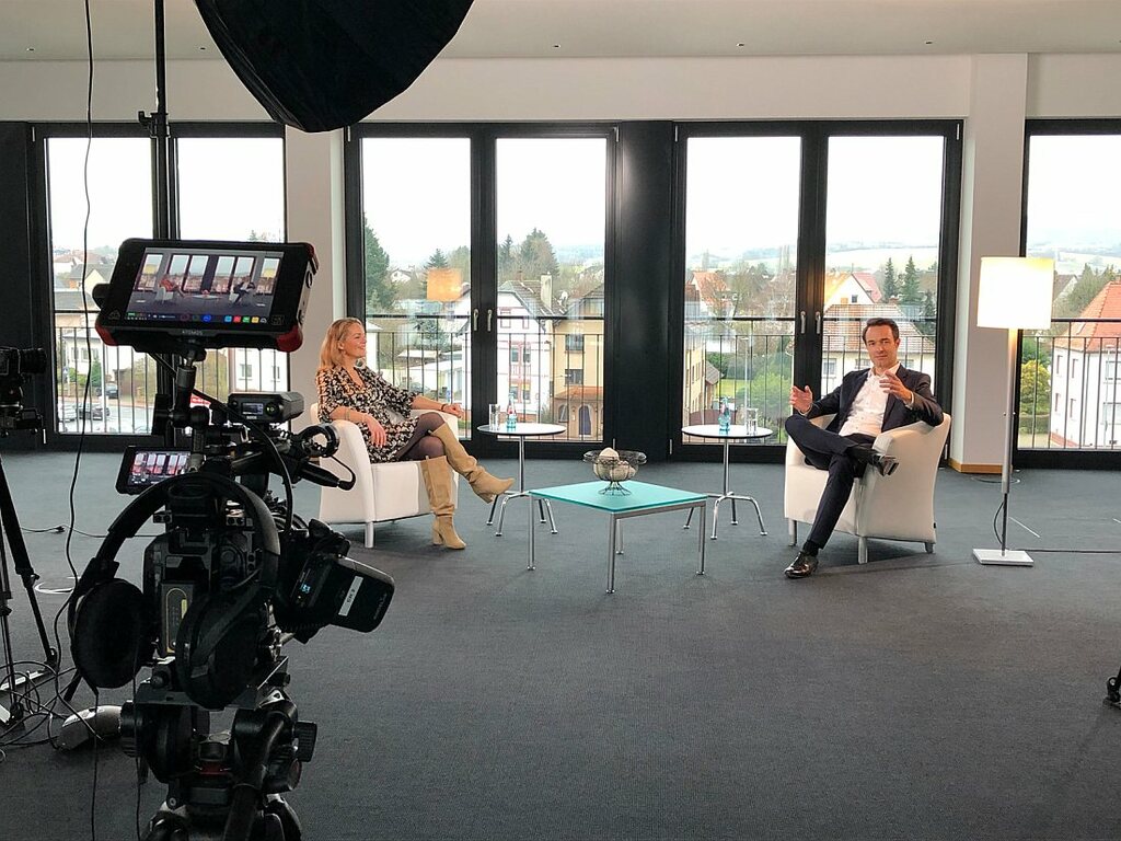Foto: Die bekannte Moderatorin und Innenarchitektin Eva Brenner im Gespräch mit Vorstandsmitglied Lars Schurich. Vom 8. bis 21. März 2021 zu sehen auf www.vrbank-mkb.de/mv-2021.
