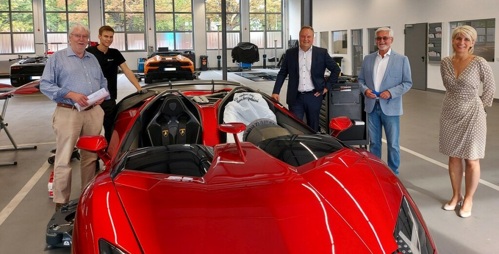 Foto (von links) Dr. h.c. Jörg-Uwe Hahn, Janus Kraemer (Auszubildender zum Kfz-Mechatroniker), Rainer Dörr, Norbert Gonter und Evelyn Dörr.